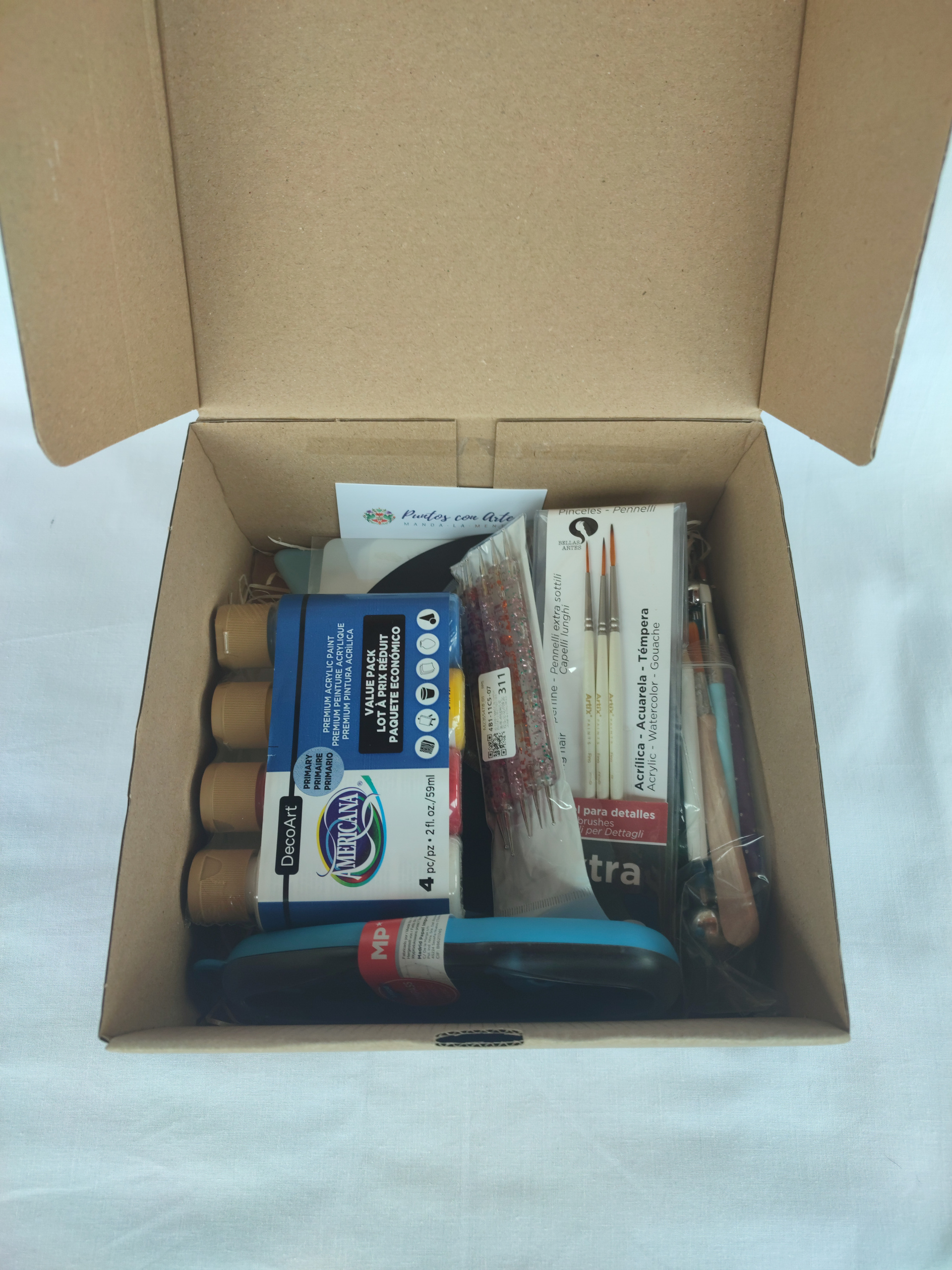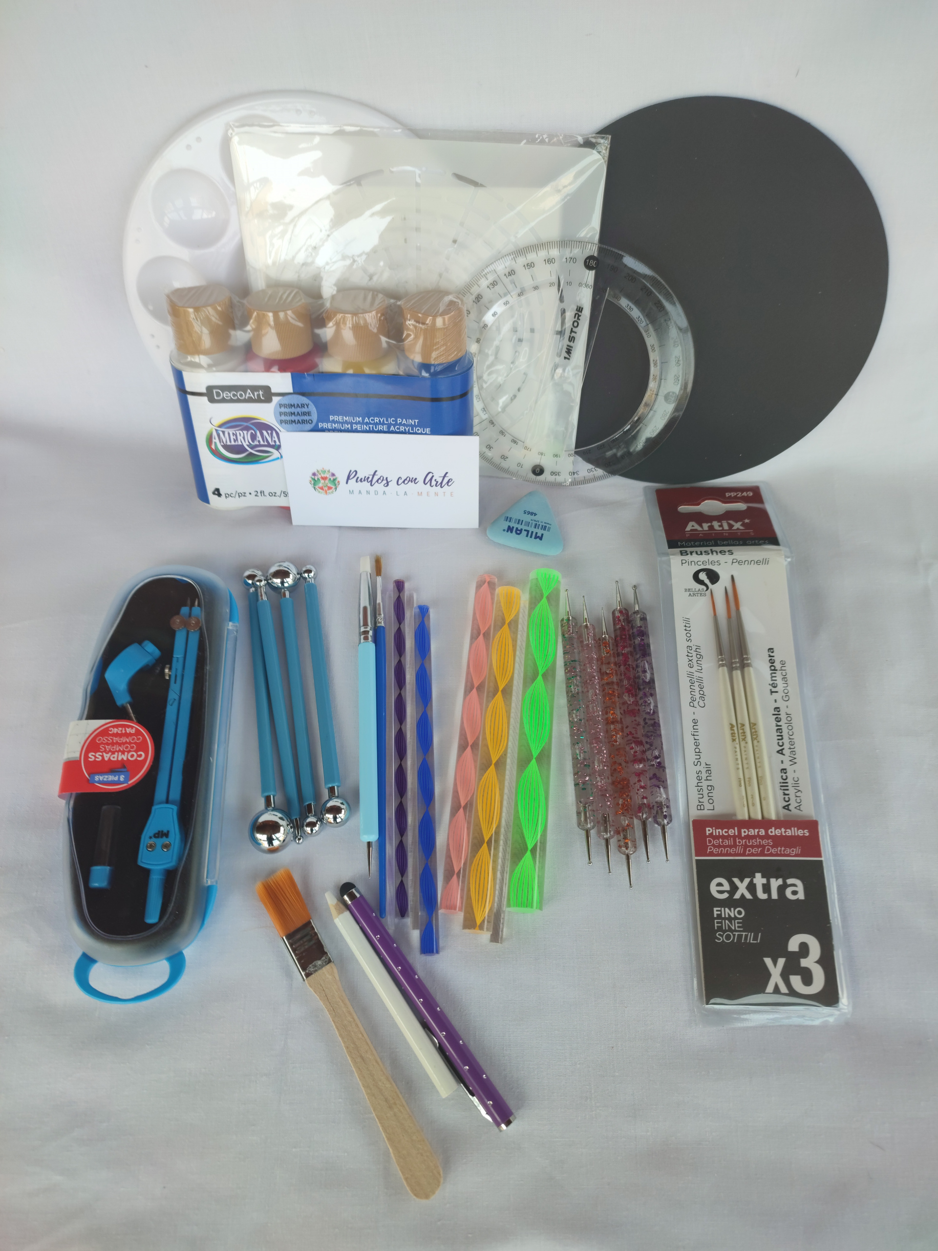 Kit completo de herramientas de punteado y pintura de mandalas. Si quieres empezar a pintar mandalas, te presento todas las herramientas que utilizo en todas mis obras. Incluye también pintura acrílica en colores primarios para hacer mezclas y conseguir cualquier color de la paleta de colores.